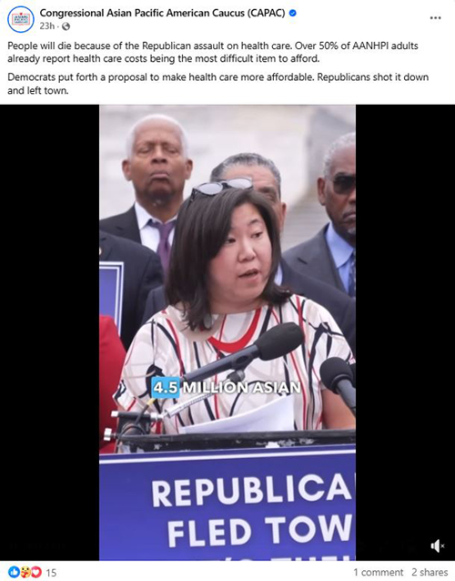 “特朗普总统和国会共和党人放弃了对美国人民的责任。他们第一天就承诺降低成本。然而,他们却接二连三地做出决定,导致价格上涨。共和党人削减了医疗补助计划(Medicaid),该计划为 450 万亚裔美国人、夏威夷原住民和太平洋岛民(AANHPI)提供医疗保健,他们还取消了帮助美国人负担医疗保险的税收抵免,导致超过 150 万 AANHPI 族群的保费翻了一番。