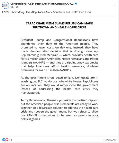 致我的共和党同僚:抛开党派之争,把美国人民放在第一位。民主党人已准备好共同努力,找到一个两党合作的解决方案,以应对医疗危机并重启政府,但我们绝不会允许我们的美国健康、健康和福利协会 (AANHPI) 社群成为你们政治游戏的棋子。”