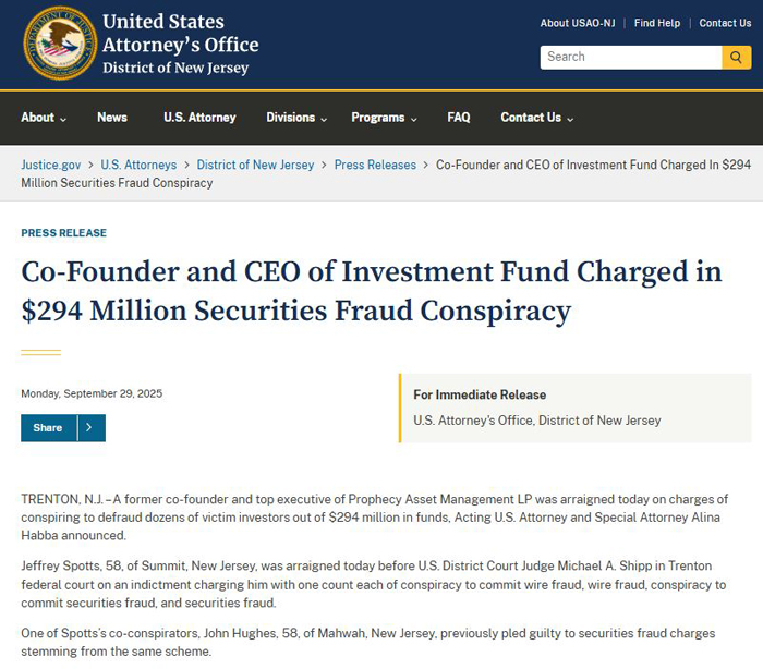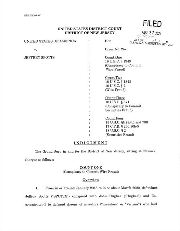 🚨 被告人是现年58岁的新泽西州萨米特居民杰弗里·斯波茨(Jeffrey Spotts),起诉书指控他犯有共谋实施电信欺诈、电信欺诈、共谋实施证券欺诈和证券欺诈等罪名。