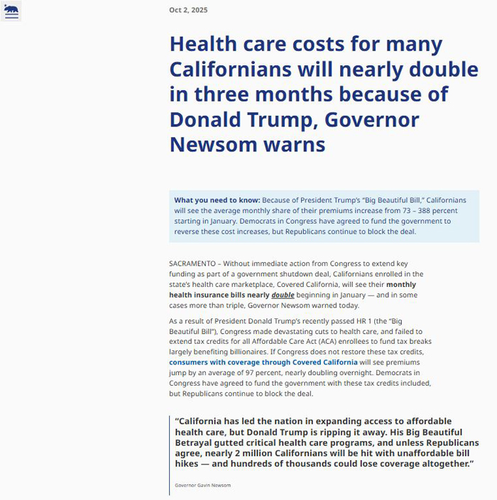關鍵詞: 加州,加州州长,纽森,Gavin Newsom,加州全保,Covered California,HR 1 法案,大美丽法案,政府关门