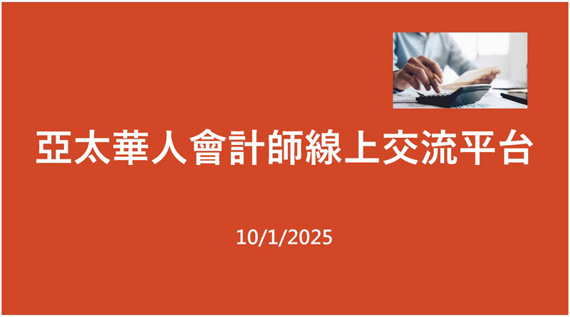 關鍵詞: 亞太華人會計師線上交流平台,張青會計師,Eric Zhang CPA,跨境遺產稅、加州遺囑認證,Form 706,Pyng Soon ESQ, CPA 孫健平律師暨會計師,第二屆亞太華人會計師合作論壇,APCCC Forum 2025