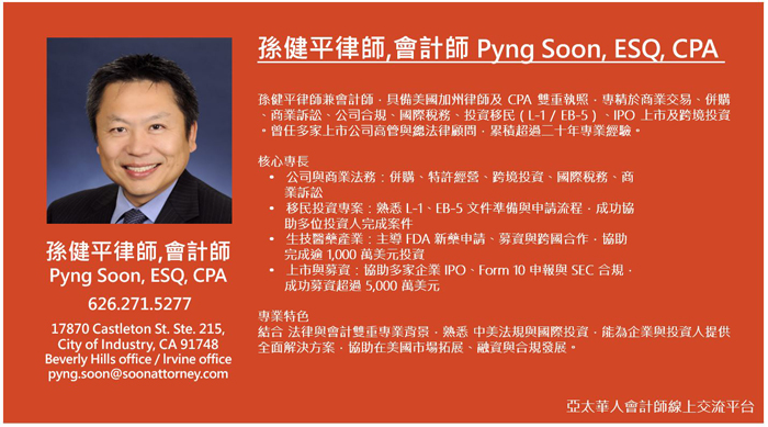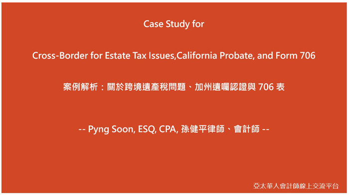 2025年10月講座於美西時間10月1日中午12:30(美東時間下午3:30)線上舉行。本期特邀 Pyng Soon ESQ, CPA 孫健平律師暨會計師主講,以“Case Study for Cross-Border Estate Tax Issues, California Probate, and Form 706”(案例解析:跨境遺產稅、加州遺囑認證與706表申報)為主題,從稅務、法務與家族傳承規劃三大面向出發,結合理論、實務與案例,帶來深度且極具實用性的專題分享。