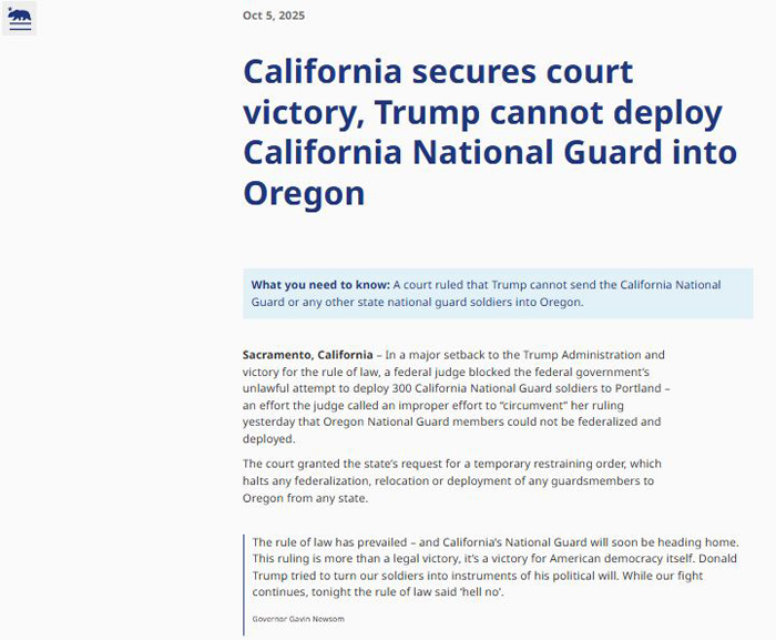 【美新社讯】10月5日周日,加州州长纽森(Gavin Newsom)发布公告宣称:法院裁定特朗普总统不得派遣加州国民警卫队或任何其他州的国民警卫队士兵进入俄勒冈州。