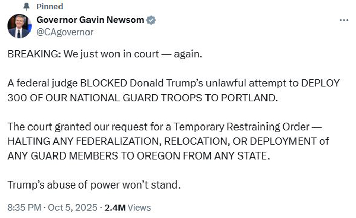“一名联邦法官阻止了联邦政府非法向俄勒冈州波特兰部署 300 名加州国民警卫队士兵的举动,这对特朗普政府来说是一次重大挫折,也是法治的一次胜利。法官称,联邦政府此举是‘规避’她昨天裁定的俄勒冈州国民警卫队成员不得联邦化和部署的不当行为。