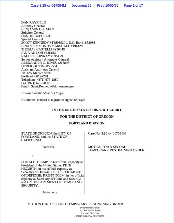 今天早些时候,加州州长纽森宣布,该州有意起诉特朗普政府,原因是白宫非法试图向俄勒冈州波特兰市部署 300 名加州国民警卫队人员。此前一天,联邦地区法院阻止了俄勒冈州国民警卫队联邦化的尝试。加州已在俄勒冈州联邦法院加入俄勒冈州的诉讼。各州申请临时限制令的联合动议请见此处。