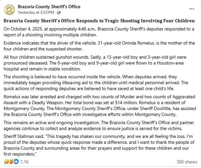 🚨 警方接到报警后赶到一家加油站。见到了报警人,也是开枪的母亲。警方在车里发现了四个孩子都遭到了枪击,其中一名13男孩和一名3岁女孩当场身亡。另外,一名8岁的男孩和一名9岁的女孩被空运到休斯顿地区的一家医院急救,目前情况稳定。
