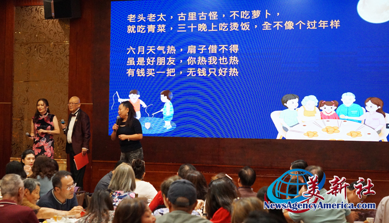 南京民谣环节,来宾们用地道南京话念出儿时的歌谣,重温乡音的同时,也拉近彼此的心灵,更引发阵阵欢笑。掼蛋比赛的冠、亚、季军一起登台接过奖状和奖金。洪飞会长代表南京会接受大画家何琦博士捐赠的限量版的版画《歌中之歌》,美国华盛顿邮报曾在2006年以大半版篇幅介绍。其间,穿插好礼抽奖,随机现金红包,100元红包,礼券,伴手礼接连不断送不完,洪飞会长乐捐500美元旅行箱三件套,最终大奖更送出价值千元的卡拉OK点唱机。激动人心,感动温馨的瞬间层出不穷。