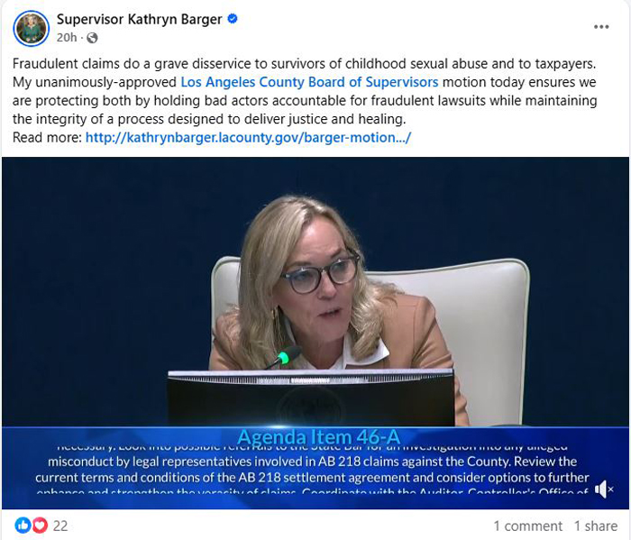 【美新社讯】10月7日周二,洛杉矶郡郡政委员会一致通过了由主席凯瑟琳·巴格(Kathryn Barger)提出的一项动议,该动议旨在调查并处理近期与根据 AB 218 法案提起的民事诉讼相关的欺诈指控。AB 218 法案由洛雷娜·冈萨雷斯(Lorena Gonzalez)起草,该法案延长了儿童性虐待诉讼的诉讼时效。