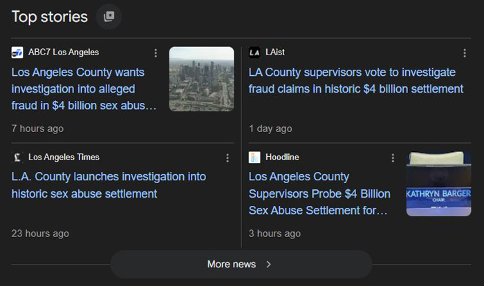 涉及的案件很多由洛杉矶市中心法律集团(DTLA)代理,该集团已处理了超过 2700 起与虐待和解相关的案件。此前,《洛杉矶时报》、《纽约时报》等披露,这项大规模性侵和解案中的一些原告收受了贿赂后才提起诉讼。《洛杉矶时报》指出在至少两起案件中,原告捏造指控,以便成为原告。《纽约时报》甚至报道,其调查发现,七名原告称收受了律所“招聘人员”的贿赂,而参与了针对洛杉矶郡的诉讼。