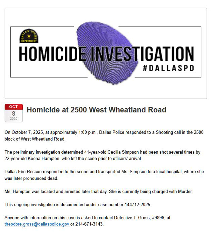 🛑 警方初步调查确定,41岁受害人塞西莉亚·辛普森(Cecilia Simpson)女士遭到22岁嫌疑人基奥娜·扎丘亚·汉普顿(Keona Zachyua Hampton)女士连开数枪,后者在警察到达前逃离了现场。
