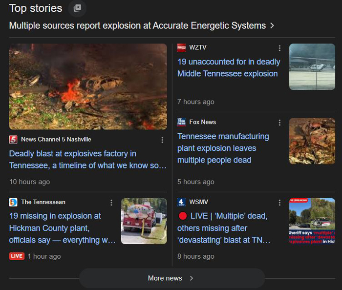 🚨 事件发生在当地时间上午 7:45 左右,事件发生在巴克斯诺特地区的 Accurate Energetic Systems 工厂。该工厂位于纳什维尔以西约60英里处,据信是一家生产炸药或弹药的工厂。