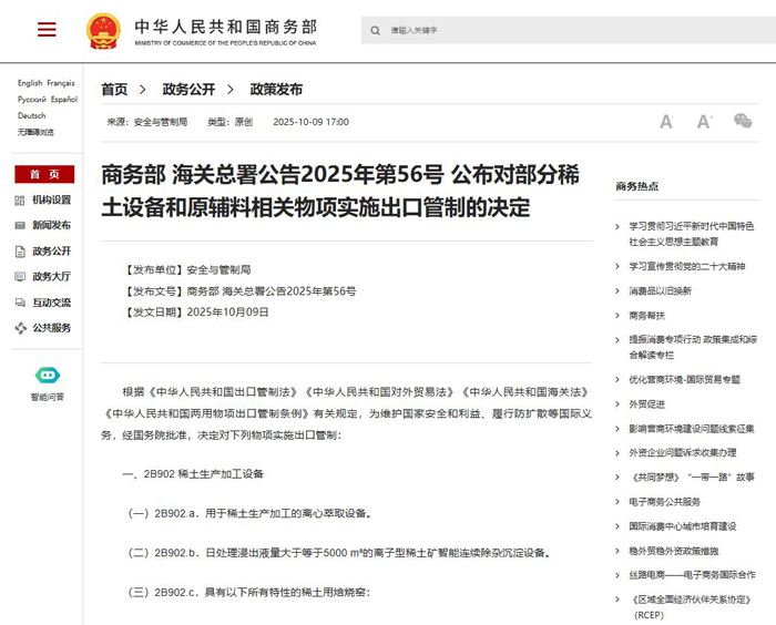【美新社讯】当地时间10月9日,中国商务部发布了多项针对稀土设备和原辅料,锂电池和人造石墨等物品的出口管制决定,引发太平洋彼岸的震动。