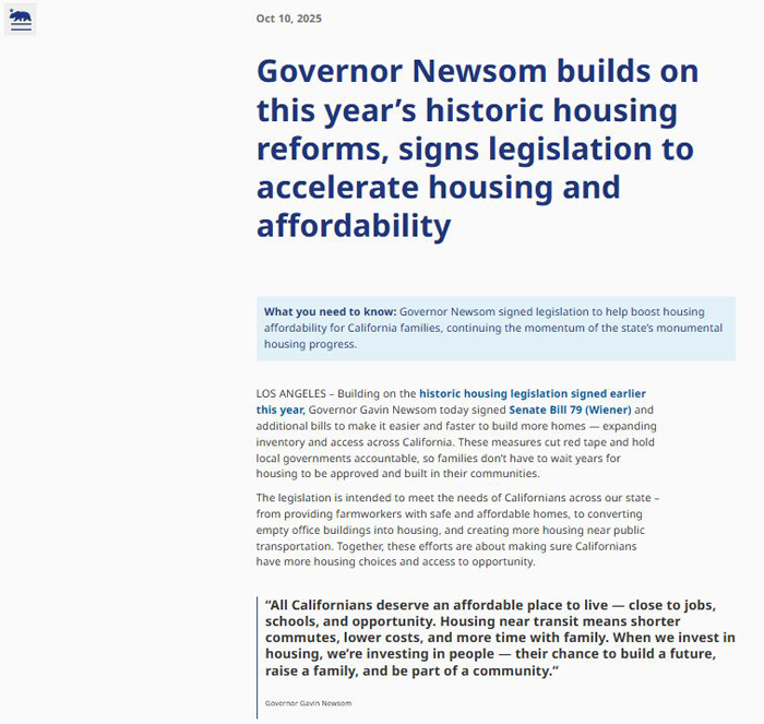 關鍵詞: 加州,加州州长,纽森,Gavin Newsom,参议院第79号法案,SB 79 号法案,住房改革,住房,可负担性
