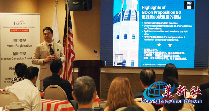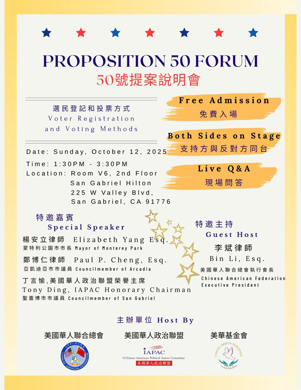 【洛杉矶讯】2025年10月12日,美国南加州华人联合总会 (美华总)、美国华人政治联盟(IAPAC)及美华基金会携手于圣盖博市希尔顿酒店举办了“加州第50号提案说明会”(CA Proposition 50 Forum)。本次活动旨在提升美籍华人的政治参与意识,普及选举知识,吸引众多社区民众踊跃参与,现场气氛热烈、理性而充满思辨。