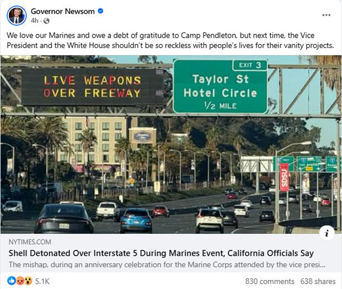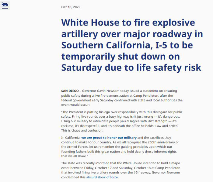 【美新社讯】10月18日周六,加州州长纽森(Gavin Newsom)发布公告指出,在靠近圣地亚哥的美国海军陆战队彭德尔顿营(Camp Pendleton)举行的实弹演示(Live Fire Demonstration)过程中,他发表声明强调要确保公共安全。此前,联邦政府已于18日周六凌晨与加州和地方当局确认了此次实弹演示活动将举行。