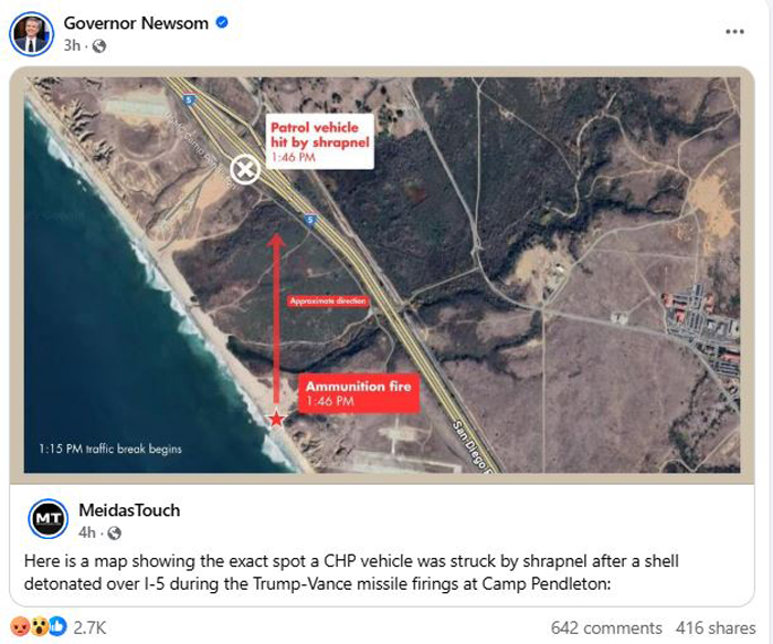 5号州际公路在18日周六因生命安全风险暂时关闭。在10月19日周日,加州州长纽森通过社交媒体又披露,在实弹演示过程中,一枚实弹在南加州5号州际公路上空爆炸,一辆加州高速公路巡警(CHP)车辆被弹片击中。同时,他也指出了确切的时间和位置。