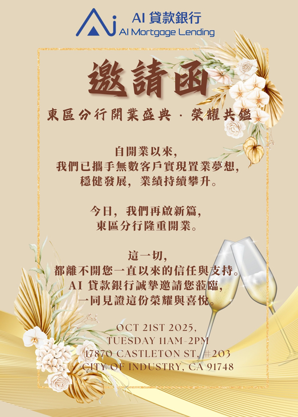 【洛杉矶讯】2025年10月21日,AI 贷款银行(AI Mortgage Lending)东区分行于东区高端核心商圈正式开业,并举行简约而隆重的开业典礼。现场汇聚了南加州地产、金融、物流界的知名企业家、商会领袖及客户代表,共同见证这一重要里程碑。