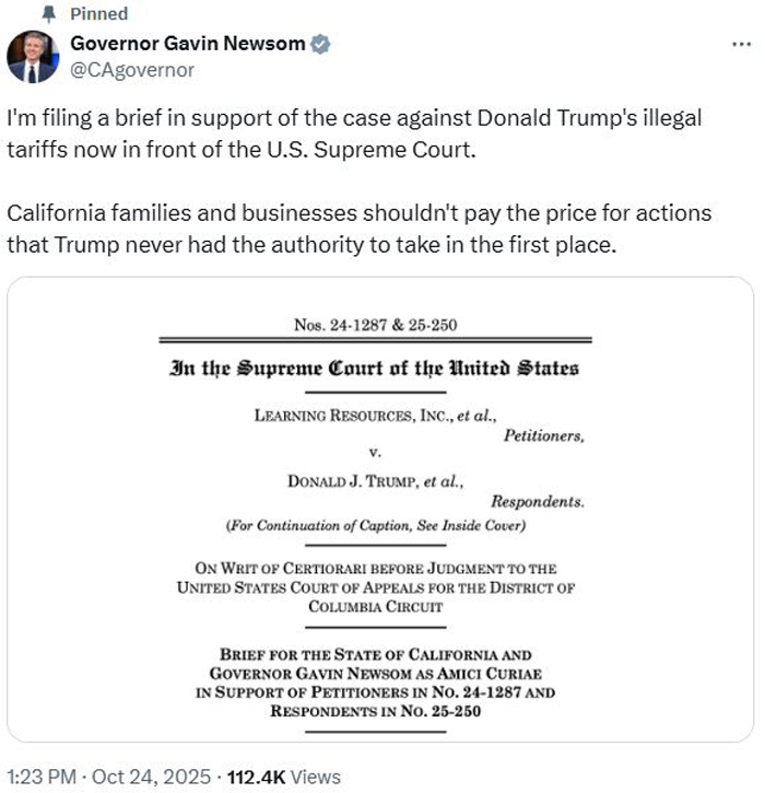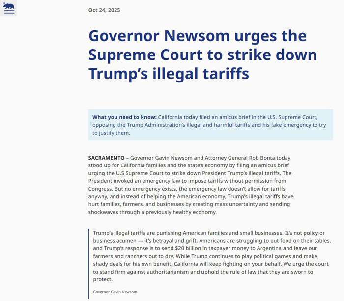 【美新社讯】10月24日周五,加州州长纽森(Gavin Newsom)发布公告:他与加州司法部长罗布·邦塔(Rob Bonta)今天为加州家庭和该州经济挺身而出,提交了一份法庭之友陈述书,敦促美国最高法院撤销特朗普总统的非法关税。