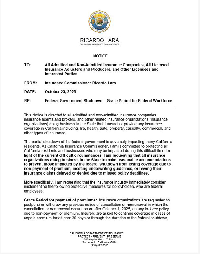 “任何人都不应该因为国会持续的不作为而失去健康或房屋保险,尤其是在我们州当前的保险危机和充满挑战的市场环境下,”拉拉专员表示。联邦政府关门对加州民众造成了严重后果,他们已经在努力寻找保障和负担得起的医疗服务。在这场领导危机和失职事件中,我们州一级必须采取一切可能的措施来保护我们的公务员以及那些依赖联邦资金的人员。