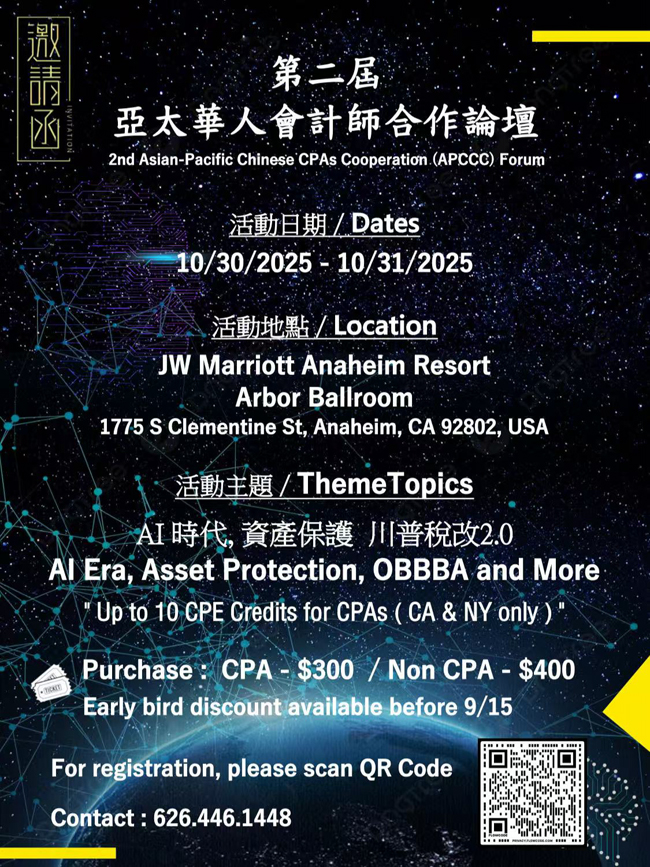 【洛杉磯訊】第二屆亞太華人會計師合作論壇(APCCC)將於10月30–31日在洛杉磯安納海姆JW萬豪酒店隆重舉行。 由洛杉磯亞太會計師協會承辦,並聯合美國國稅局(IRS)及亞太各地區財稅會計專業團體,本屆論壇以「AI時代・資產保護・川普稅改2.0」為主題,聚焦全球稅務改革趨勢、人工智能對財稅專業的深遠影響、以及高資產人士的資產保全與財稅合規規劃策略。