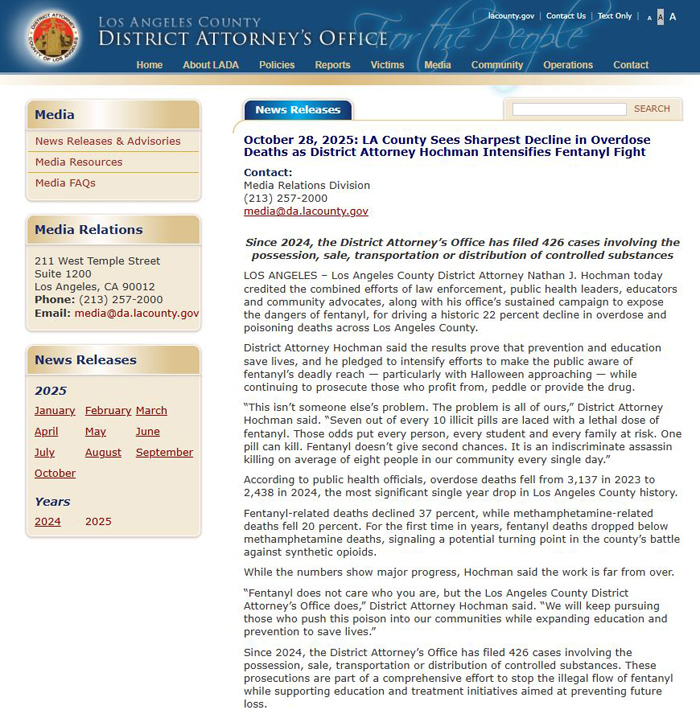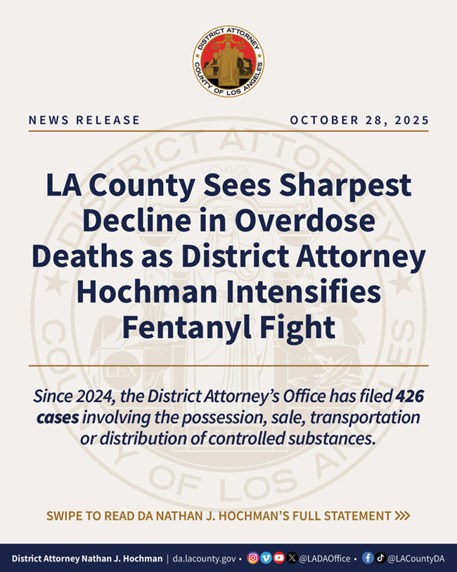 【美新社洛杉矶讯】10月28日,洛杉矶郡地区检察长(LA County DA)霍赫曼(Nathan Hochman)办公室发布公告:执法部门、公共卫生部门领导、教育工作者和社区倡导者的共同努力,以及他办公室持续开展的揭露芬太尼危害的宣传活动,促成了洛杉矶郡过量用药和中毒死亡人数历史性下降22%。