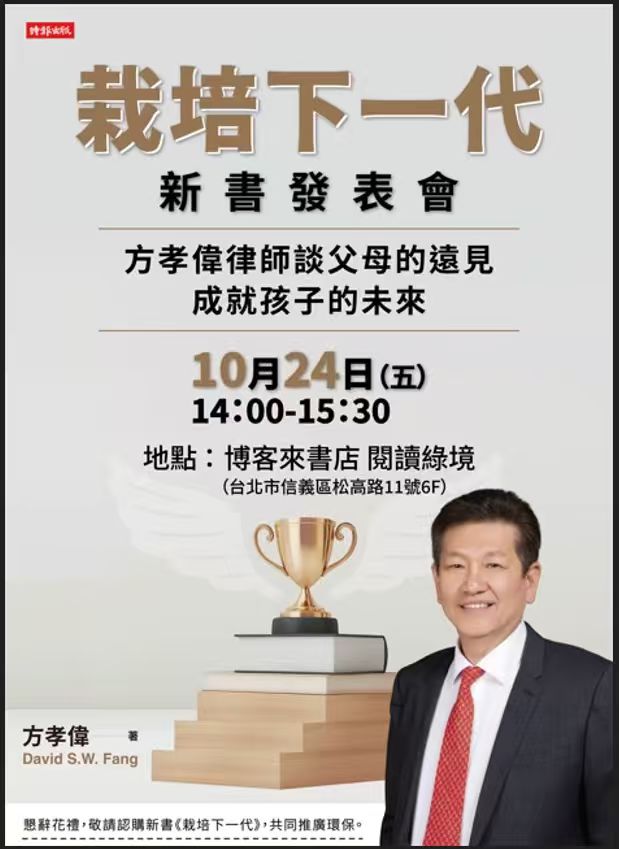 【台北訊】2025年10月24日,美國知名律師 方孝偉的新書《栽培下一代》發表會,在台北信義區【博客來書店書院】隆重舉行。