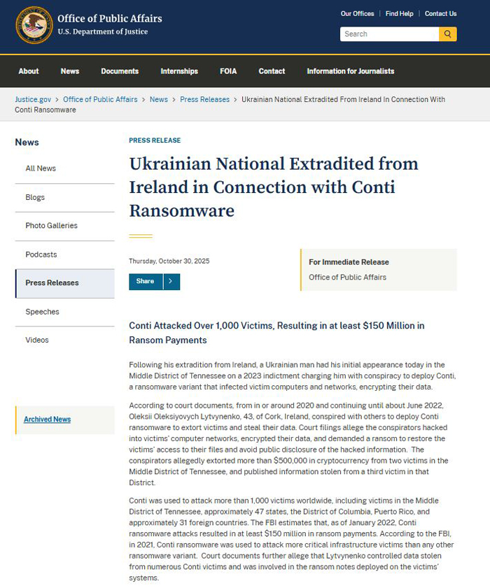 【美新社讯】10月30日周四,美国司法部(DOJ)公告披露:一名乌克兰男性公民因涉嫌 Conti 勒索软件被从爱尔兰引渡来美受审。30日,他在田纳西州中区法院首次出庭,被控于 2023 年串谋部署 Conti 勒索软件,该软件会感染受害者的计算机和网络,并加密其数据。Conti 勒索软件攻击超过 1000 名受害者,勒索金额至少达 1.5 亿美元。