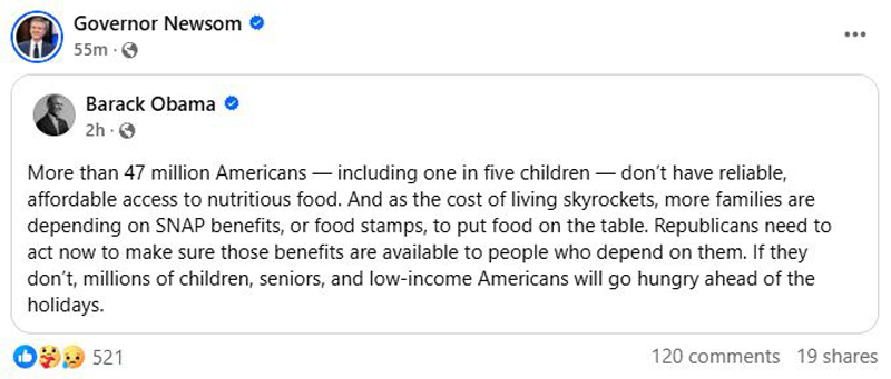 前总统奥巴马督促联邦政府继续发放 SNAP 福利(州长纽森办公室社交媒体图片)