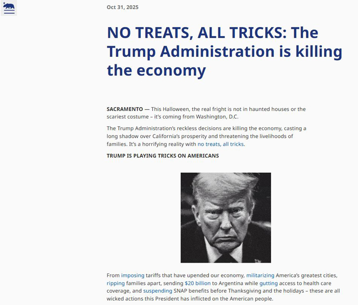 特朗普政府鲁莽的决策正在扼杀经济,给加州的繁荣蒙上阴影,并威胁着无数家庭的生计。这是一个可怕的现实,没有糖果,只有恶作剧!”