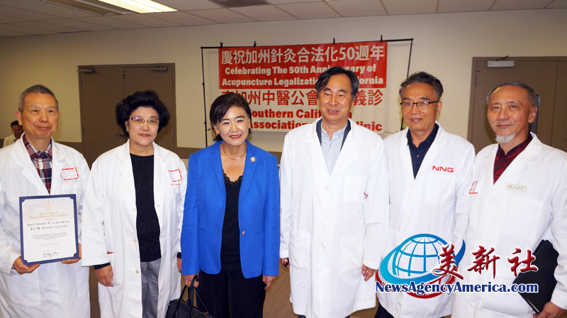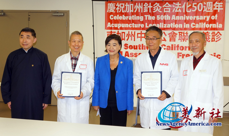 当天,美国国会众议员赵美心博士(Dr.Judy Chu)不顾骨折困扰,亲临现场,向南加州中医公会联合会颁发美国国会褒奖证书,表彰中医针灸界五十年来对社区健康事业的卓越贡献,由李安岳、苏华昌、于家山、李景新等中医师代表领受。