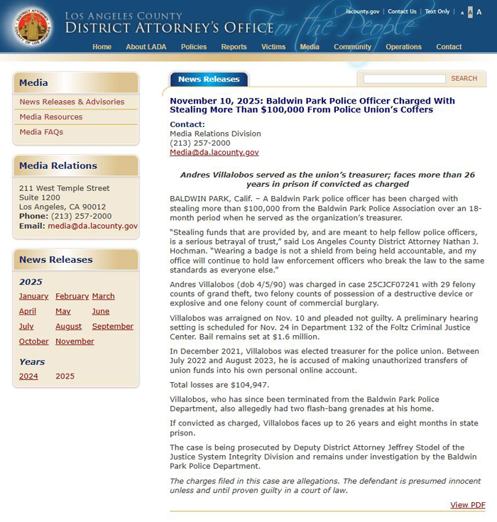 【美新社洛杉矶讯】11月10日,洛杉矶郡地区检察长(LA County DA)霍赫曼(Nathan Hochman)办公室发布公告:一名鲍德温公园市警察局(Baldwin Park PD)警官被指控,在其担任鲍德温公园市警察协会财务主管的18个月期间,从该协会窃取超过10万美元。