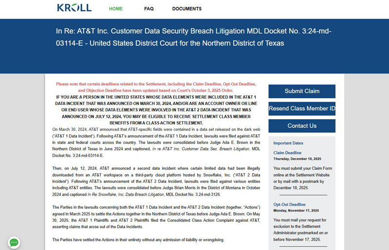 如果您是美国境内的个人,且您的数据元素包含在2024年3月30日公布的 AT&T 1 数据泄露事件中,和/或您是账户所有者、线路或最终用户,且您的数据元素包含在2024年7月12日公布的 AT&T 2 数据泄露事件中,您可能有资格从集体诉讼和解中获得集体成员权益。
