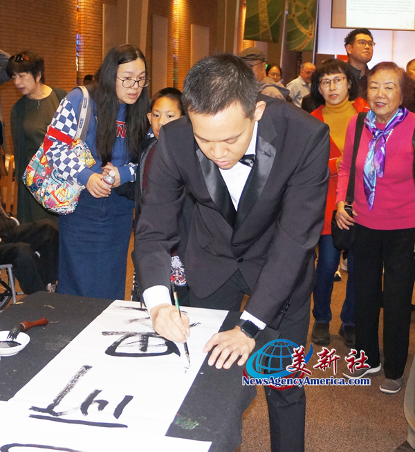 除了在音樂上的卓越表現,Leland更展現了另一項令人驚艷的才華書法。當他在現場鋪紙、提筆的瞬間,整個空間再次安靜下來。他專注地伏身,筆鋒在宣紙上游走,起落之間乾脆利落、氣勢十足。