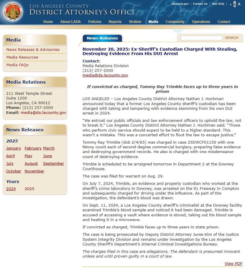 🛑 2024年7月7日,在洛杉矶郡警长办公室(LASD)唐尼分局犯罪实验室工作的证据和物品保管员特里姆布尔,在康普顿91号高速公路上被捕,随后被控酒后驾车。作为调查的一部分,警方提取了被告的血液样本。
