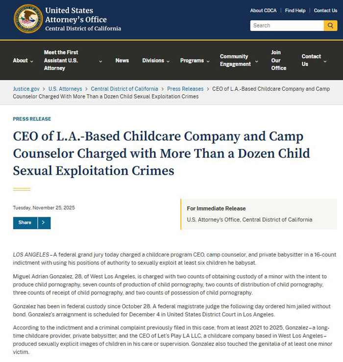 🚨 根据起诉书和此前提交的刑事诉状,从至少2021年到2025年,被告人冈萨雷斯,作为一名长期从事儿童保育工作、私人保姆,同时也是位于西洛杉矶的托儿公司 Let’s Play LA LLC 的首席执行官,制作了他照看或监管的儿童的性虐待图像。被告人冈萨雷斯还触摸了至少一名未成年受害者的生殖器官。