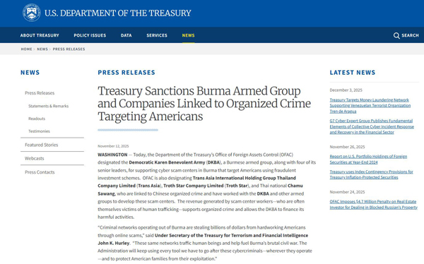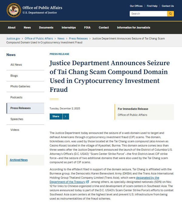 【美新社讯】12月2日周二,美国联邦调查局(FBI)、美国司法部(DOJ)公告披露:FBI 圣地亚哥分局调查促成联邦诈骗中心打击小组查封“缅甸泰昌诈骗园区(Tai Chang Scam Compound in Burma)”使用的虚假加密货币投资域名。