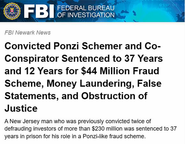 【美新社讯】近日,美国联邦调查局(FBI)、美国司法部(DOJ)发布公告披露:一庞氏骗局主犯及其同谋,因4400万美元欺诈、洗钱、虚假陈述和妨碍司法等罪行,被判处 37 年和 12 年监禁。