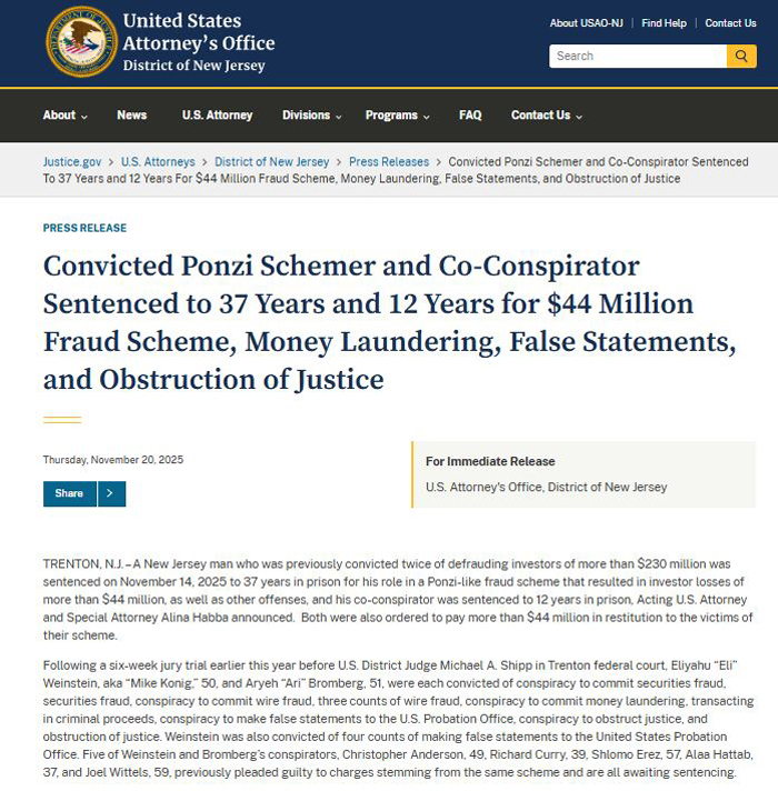 🚨 一名此前曾两次因诈骗投资者超过 2.3 亿美元而被定罪的新泽西州男子于2025年11月14日被判处 37 年监禁,罪名是他参与了一起类似庞氏骗局的欺诈案,导致投资者损失超过 4400 万美元,以及其他相关罪行;其同谋被判处 12 年监禁。两人还被勒令向受害者支付超过 4400 万美元的赔偿金。