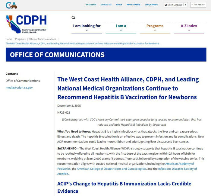 【美新社讯】 12月5日周五,加州州长纽森(Gavin Newsom)发布公告:作为西海岸健康联盟(West Coast Health Alliance)的成员,加州发布了一份关于疾病控制与预防中心(CDC)免疫实践咨询委员会(ACIP)投票决定终止新生儿普遍接种乙肝疫苗(hepatitis B vaccinations)建议的最新声明。