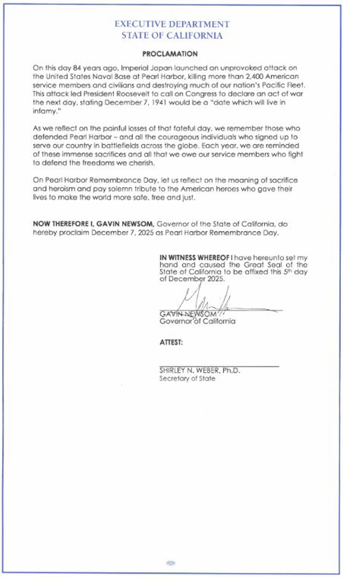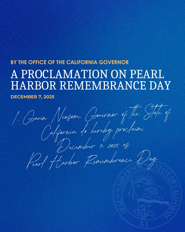 【美新社讯】12月7日周日,加州州长纽森(Gavin Newsom)发布公告,宣布将2025年12月7日定为珍珠港纪念日。