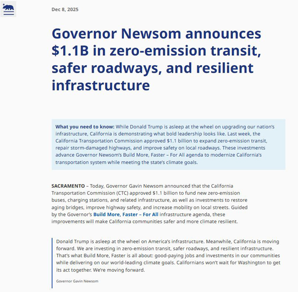 【美新社讯】12月8日周一,加州州长(Gavin Newsom)宣布,加州交通委员会(CTC)已批准 11 亿美元,用于资助新型零排放公交车、充电站及相关基础设施建设,以及投资修复老旧桥梁、改善高速公路安全并提升当地街道的通行能力。在州长“建设更多、更快、惠及所有人(Build More, Faster – For All)”基础设施议程的指导下,这些改进措施将使加州社区更加安全,更具气候适应能力。