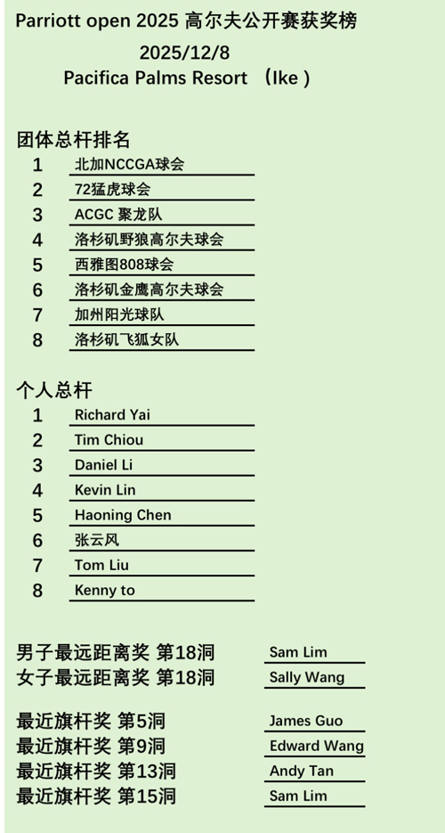 经过一天的紧张赛事和激烈争夺,北加 NCCGA 球会、72猛虎球会(SCFT)、ACGC 聚龙队分别获得团体总杆冠、亚、季军,并获得 6000 美元、4000 美元、2400 美元的奖金。