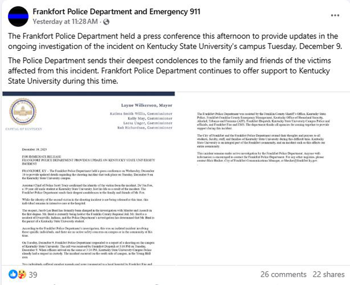 🚔🚔 肯塔基州法兰克福市警察局(FPD)11日公告披露: