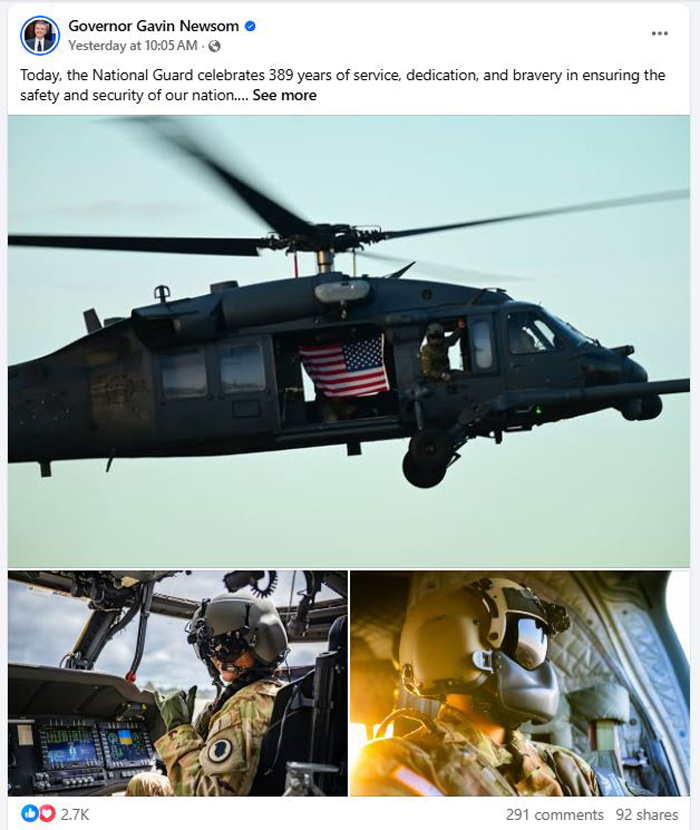 加州国民警卫队成立于 1850 年,它一直以来都表彰其成员为他人提供的服务。然而,特朗普政府却非法地将他们部署到洛杉矶,让他们对抗自己的社区,破坏了他们在州内开展的重要公共安全和人道主义工作。