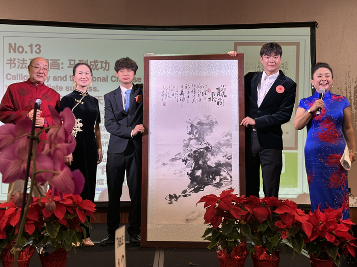 拍賣成交價最高的作品:著名畫家潘天壽之子、著名畫家潘建業的書法及國畫作品《馬到成功》,由富蘭克林基金會家長執委會副主席申劉芷蕾(左2)拍得