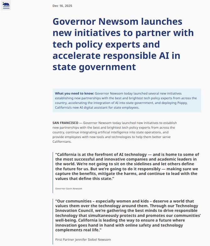 【美新社讯】12月16日周二,加州州长纽森(Gavin Newsom)发布公告:启动新举措,旨在与来自全美国各地的顶尖科技政策专家建立新的合作伙伴关系,继续将人工智能融入州政府运作,并为员工提供新的工具和技术,帮助他们更好地服务加州民众。