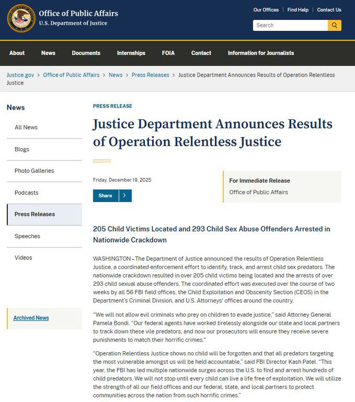 【美新社讯】12月19日,司法部(DOJ)公告披露“不懈正义行动(Relentless Justice)”的成果。这是一项旨在识别、追踪和逮捕儿童性犯罪者的协调执法行动。