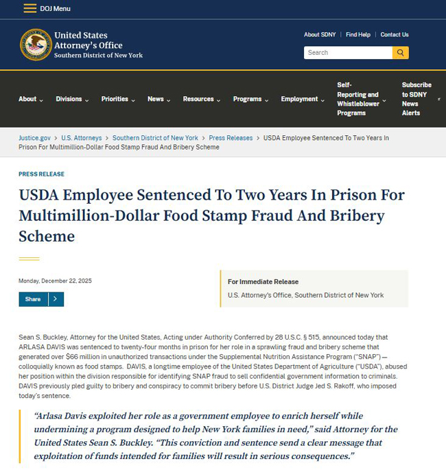🛑 被告人是现年56岁、居住在纽约州加德纳的女子 -- 阿尔拉萨·戴维斯(ARLASA DAVIS)。她因参与一项涉及范围广泛的欺诈和贿赂计划而被判处24个月监禁。该计划利用补充营养援助计划(“SNAP”,俗称食品券)进行未经授权的交易,涉案金额超过 6600 万美元。被告人戴维斯此前已在美国地区法官 Jed S. Rakoff 面前承认贿赂和串谋贿赂罪,Rakoff 法官22日宣布了上述判决。