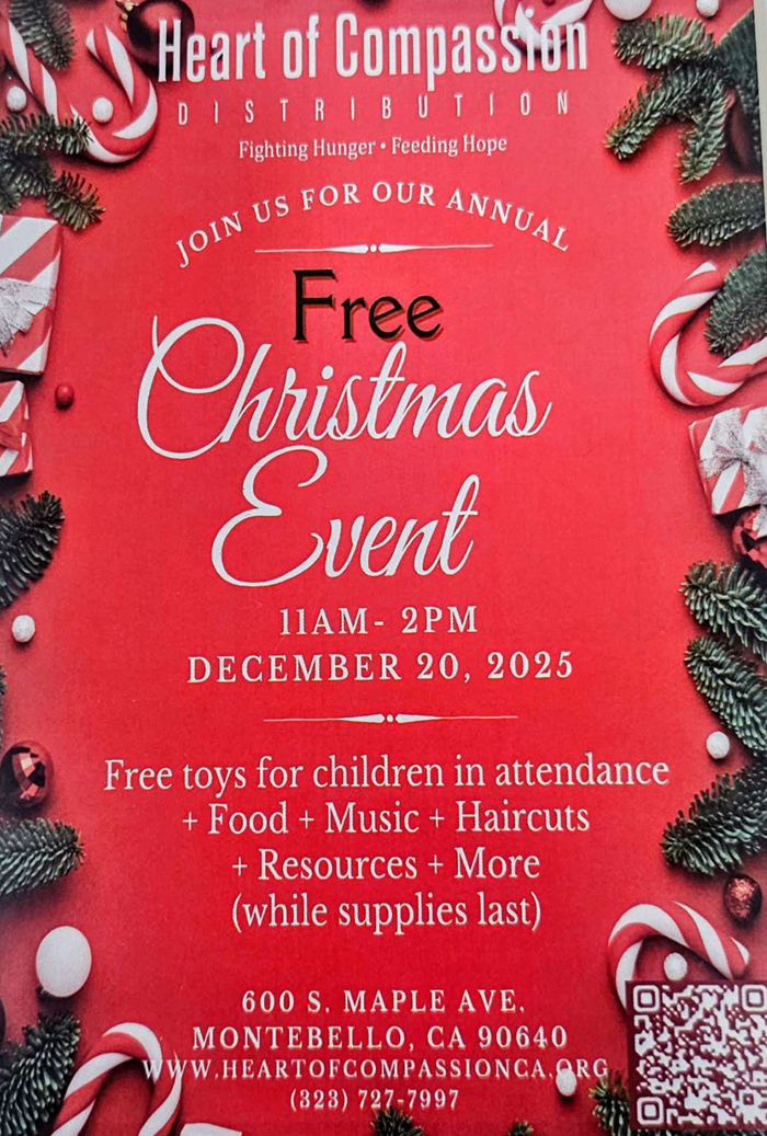 為了讓低收入家庭、弱勢族群與需要幫助的民眾,也能在歲末寒冬中感受到節日的喜悅與關懷,由 Heart of Compassion「憐憫之心」食物銀行主辦的一年一度 「聖誕節免費發放活動」,於 12 月 20 日(星期六)在洛杉磯蒙迪貝羅(Montebello)盛大舉行。這一天,不只是物資的分享,更是一場愛與希望的集體行動。