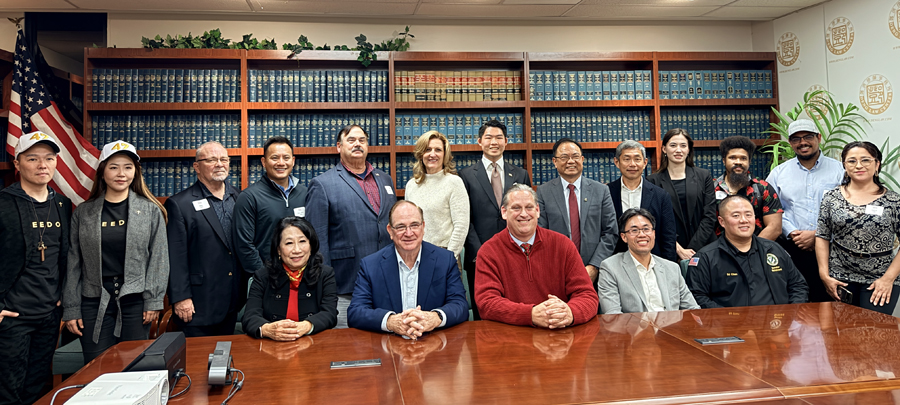 柔似蜜市议员李志(STEVEN LY,前排右2),前加州共和党议长 BOB HUFF 与夫人何美湄(前排左2、1),前亚凯迪亚市长 PETER AMUNDSON(后排左3)和前市议员 APRIL VERLATO(后排左4)